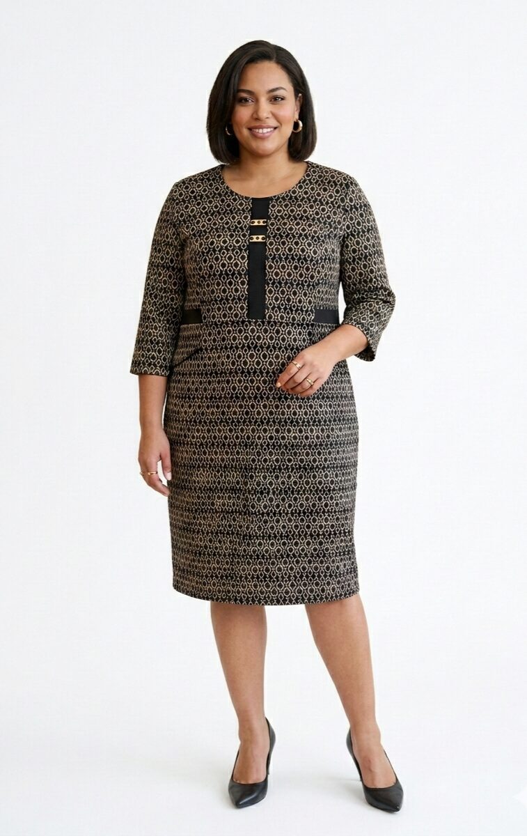 Κομψό midi φόρεμα σε ίσια γραμμή.  Διαθέτει ένα γεωμετρικό επαναλαμβανόμενο print με κρίκους σε απόχρωση του μπέζ / χρυσού πάνω σε μαύρο φόντο, που προσδίδει μια vintage αλλά και διαχρονική αίσθηση.